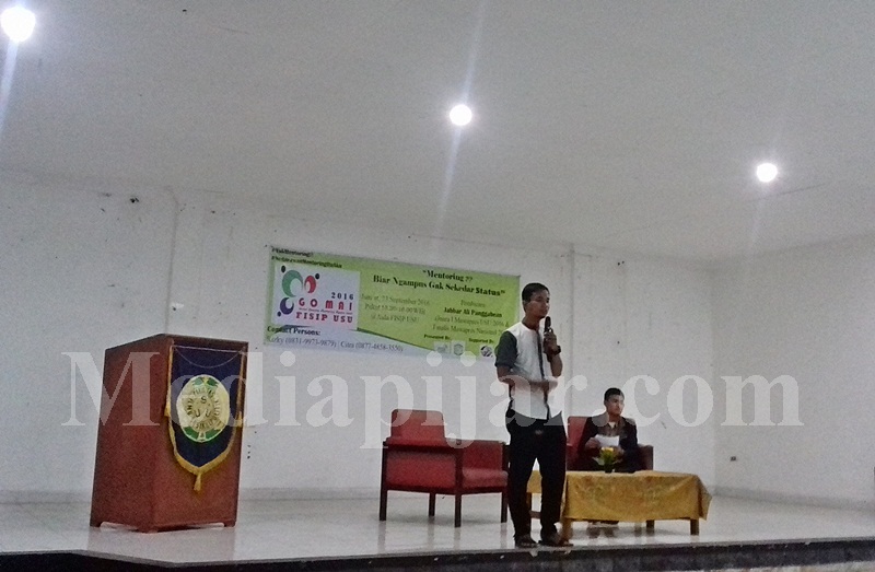 Pijar,Medan. Jumat, (23/09) Unit kegiatan Mahasiswa Islam (UKMI) As-Siyasah Fakultas Ilmu Sosial dan Ilmu Politik (FISIP) Universitas Sumatera Utara (USU) mengadakan acara Grand Opening Mentoring Agama Islam (GOMAI) FISIP USU 2016 dengan tema “Mentoring, Biar Ngampus Gak Sekedar Status”. Acara ini bertempat di Aula Serbaguna FISIP USU dengan jumlah peserta 154 orang. Acara dimulai pukul 14.00 WIB.