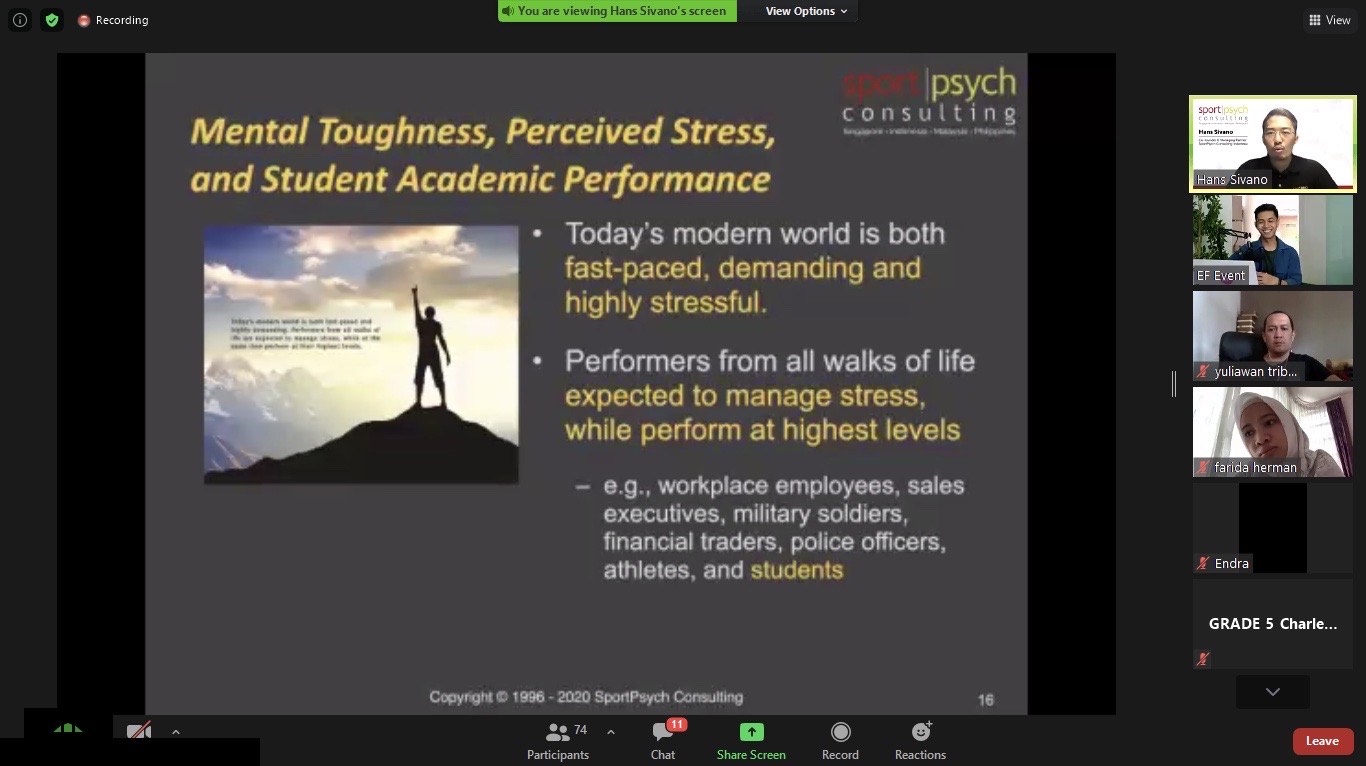 Pijar, Medan. Mental toughness atau mental yang tangguh sangat penting untuk diri kita. Orang yang bermental tangguh adalah orang yang pintar dan mampu beradaptasi dengan keadaan juga lingkungan sekitarnya dan ini sangat penting untuk diketahui semua orang terlebih remaja. Untuk itu, English First (EF) Surabaya mengadakan webinar bertajuk “Mental Toughness For Teen: Kupas Tuntas Rahasia Meningkatkan Performa Akademik dan Life Skills” pada Sabtu (06/02) pukul 10.00 WIB. Webinar ini berlangsung selama kurang lebih satu jam dan diikuti oleh 70 orang lebih peserta via aplikasi Zoom.