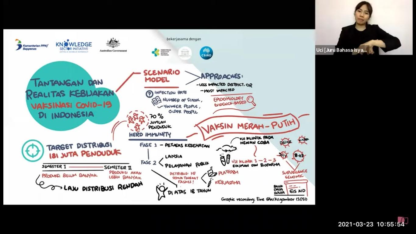 Diskusi ini dimoderatori oleh Tri Murti dan mengundang 3 narasumber yang memiliki latar belakang berbeda, yakni: Dr. Dian, mewakili Kementerian Kesehatan (Kemenkes); Prof. Dr. Herawati, Wakil Kepala LBM Eijkmen Bidang Riset Fundamental; dan Dr. Mahesh Prakash, yang merupakan perwakilan dari CSIRO Australia. Ketiga narasumber ini membahas bingkai yang sama, yakni vaksinasi Covid-19.