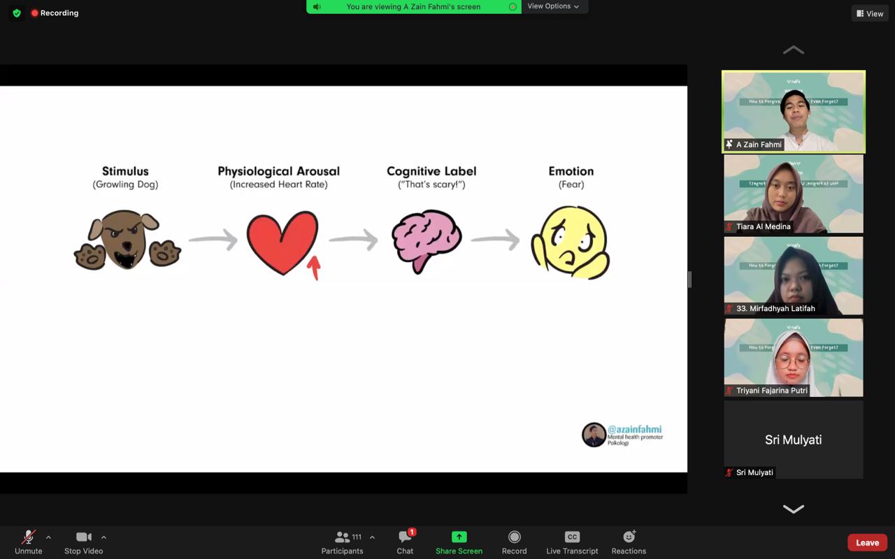 Dimoderatori oleh Karima Nada Medina, webinar ini menghadirkan dua pemateri, yakni Ahmad Zain Gahmiyang, seorang mental health promoter dan Farisan Primana Muslim, mahasiswa S2 yang berkuliah di Al-Azhar University Cairo, Mesir.