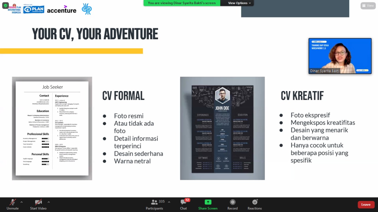 Selanjutnya, Dinar mengajarkan cara menulis CV serta penempatan surat pengantar dan portofolio yang tepat. Dinar juga menganjurkan untuk mengaktivasi aplikasi LinkedIn serta turut membagikan pengalamannya membangun koneksi melalui media sosial profesional tersebut.