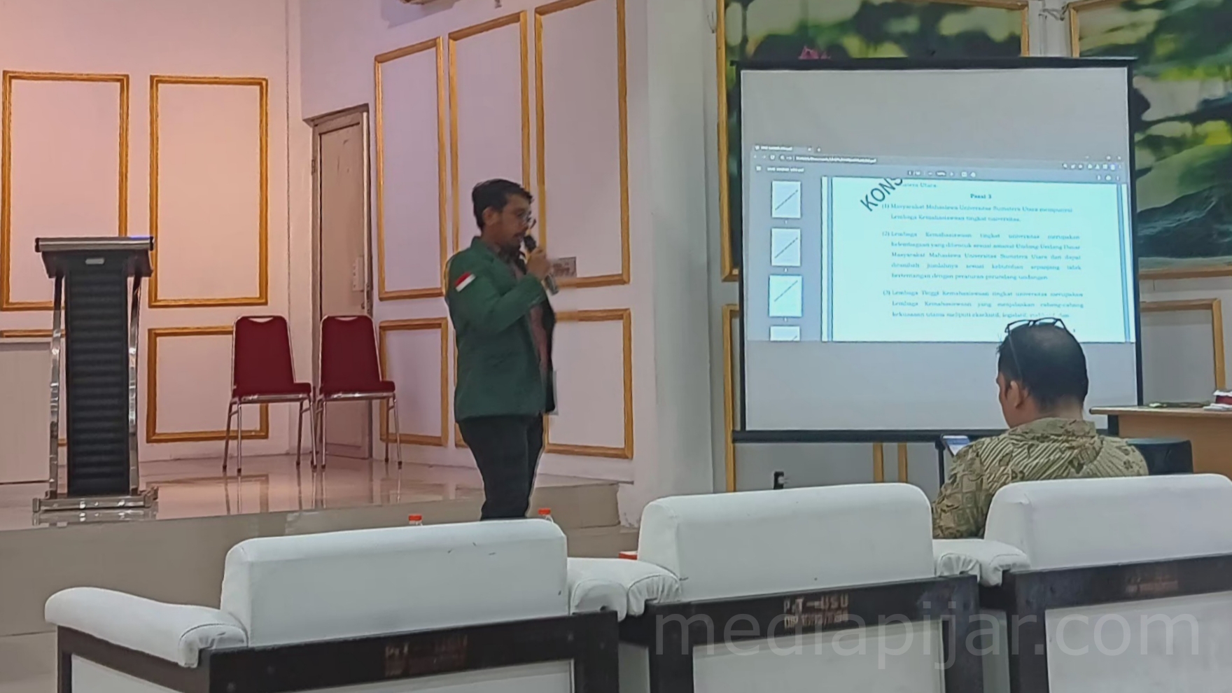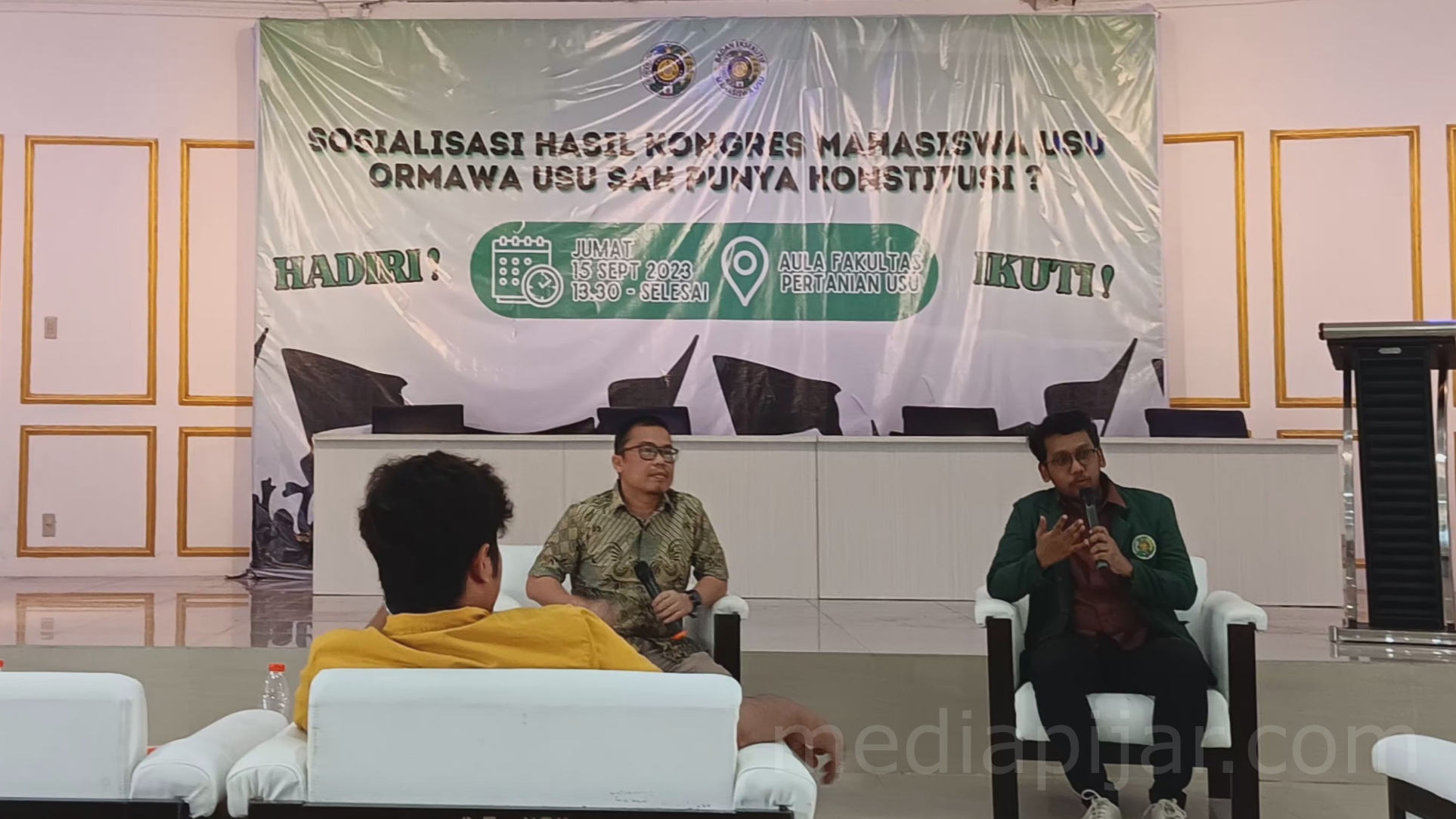 Aziz Syahputra selaku ketua BEM USU menyampaikan, berdasarkan hasil Kongres Mahasiswa, telah ditetapkan konstitusi Ormawa USU 2023 yang berlaku sejak pengesahannya pada 22 Agustus 2023.