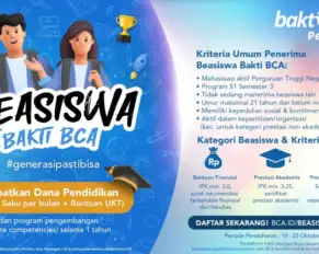 Pendaftaran beasiswa Bakti BCA (Bank Central Asia) periode 2025 resmi dibuka. Pendaftaran dibuka sejak 9 September hingga 31 Oktober 2024. Beasiswa ini sudah ada sejak tahun 1999 sebagai komitmen untuk senantiasa mendukung visi keberlanjutan Indonesia dalam meningkatkan mutu pendidikan dan daya saing sumber daya manusia.